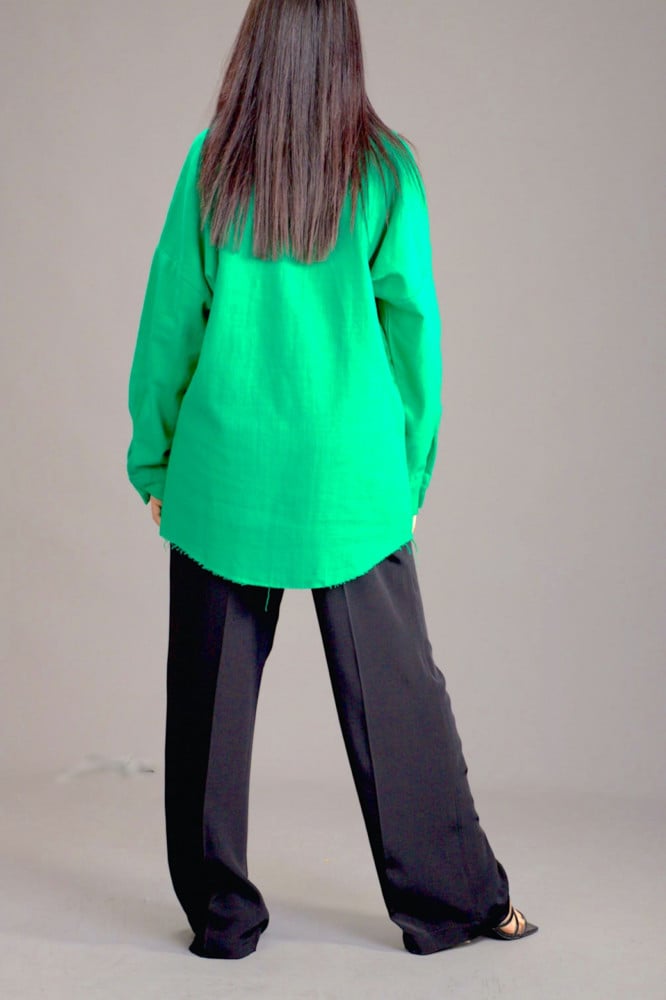 قميص اخضر سادة بأزرار أمامية جيب قلاب منخفض الاكتاف
