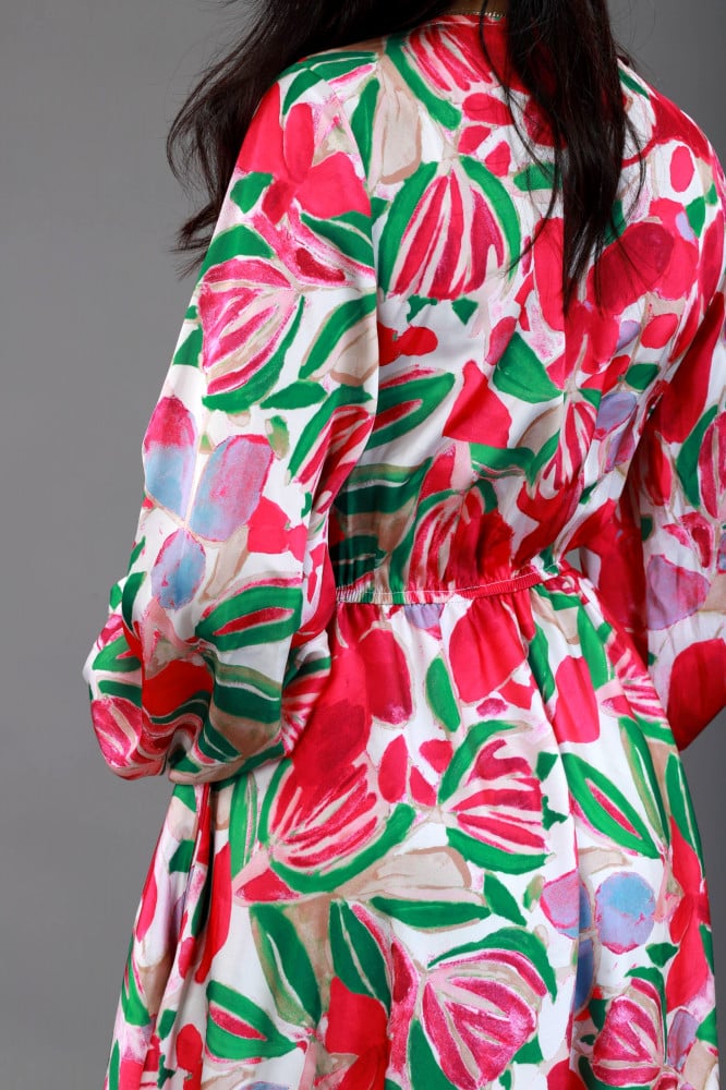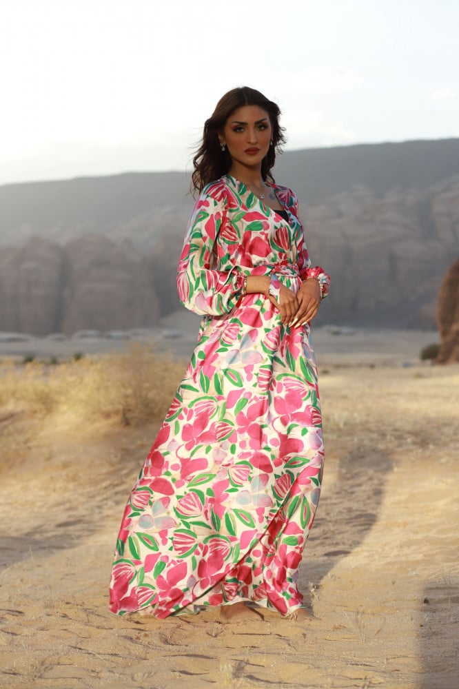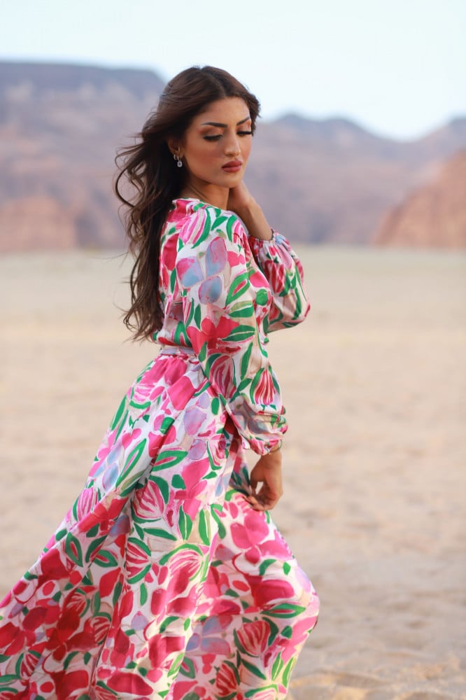 فستان فوشيا طويل كم منفوخ فانوس مزهر شامل